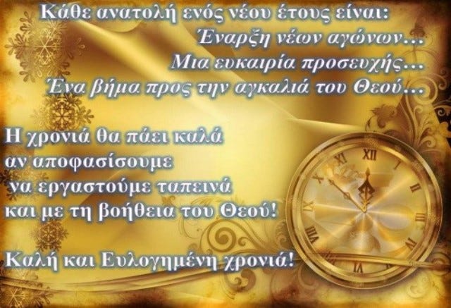 Νὰ εὐχηθοῦμε, λοιπόν, νὰ εἶναι τὰ χρόνια τῆς ζωῆς μας ὄχι τόσο πολλὰ ἀλλὰ καλὰ καὶ ἀγαθὰ ἐν Κυρίῳ, μὲ πολλὲς εὐκαιρίες γιὰ μετάνοια καὶ μὲ τὴν συνείδηση ὅτι μόνον «μὲ ἀγάπη, μὲ ὑγεία, μὲ τὴν θεία εὐλογία» καὶ τὴν εὐλογία πάντων τῶν Ἁγίων Του θὰ μπορέσουμε νὰ οἰκονομήσουμε ἔτσι τὸν παρόντα χρόνο τῆς ζωῆς μας, ὥστε νὰ ζήσουμε καὶ μάλιστα νὰ συζήσουμε μὲ τὸν Κύριο καὶ μὲ τοὺς ἀγαθούς Του φίλους, τοὺς Ἁγίους, στὸν αἰῶνα τὸν ἅπαντα. Ἀμήν! Γένοιτο! Εὐλογημένος ὁ νέος χρόνος, καρπὸς τῆς χρηστότητός Του!