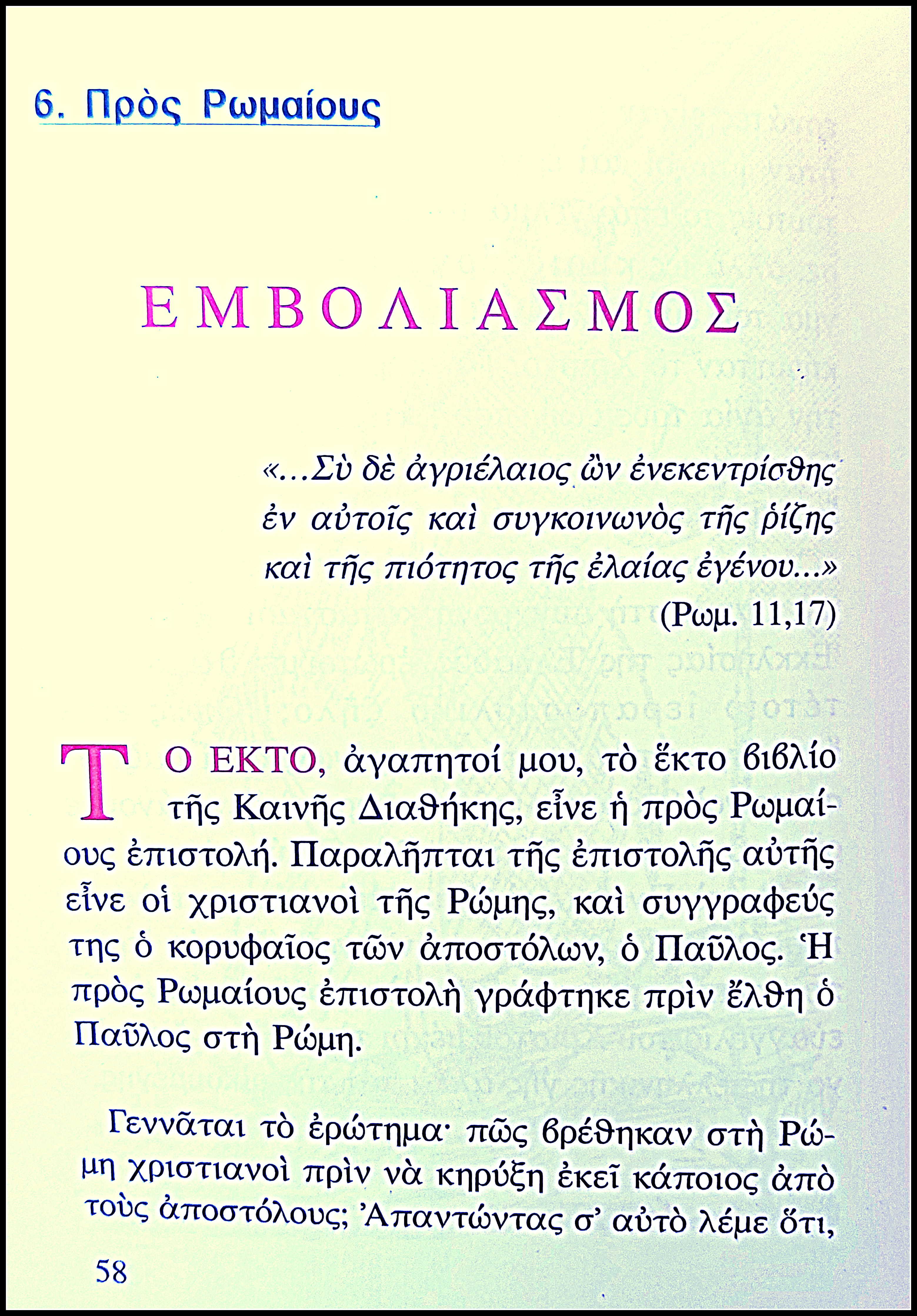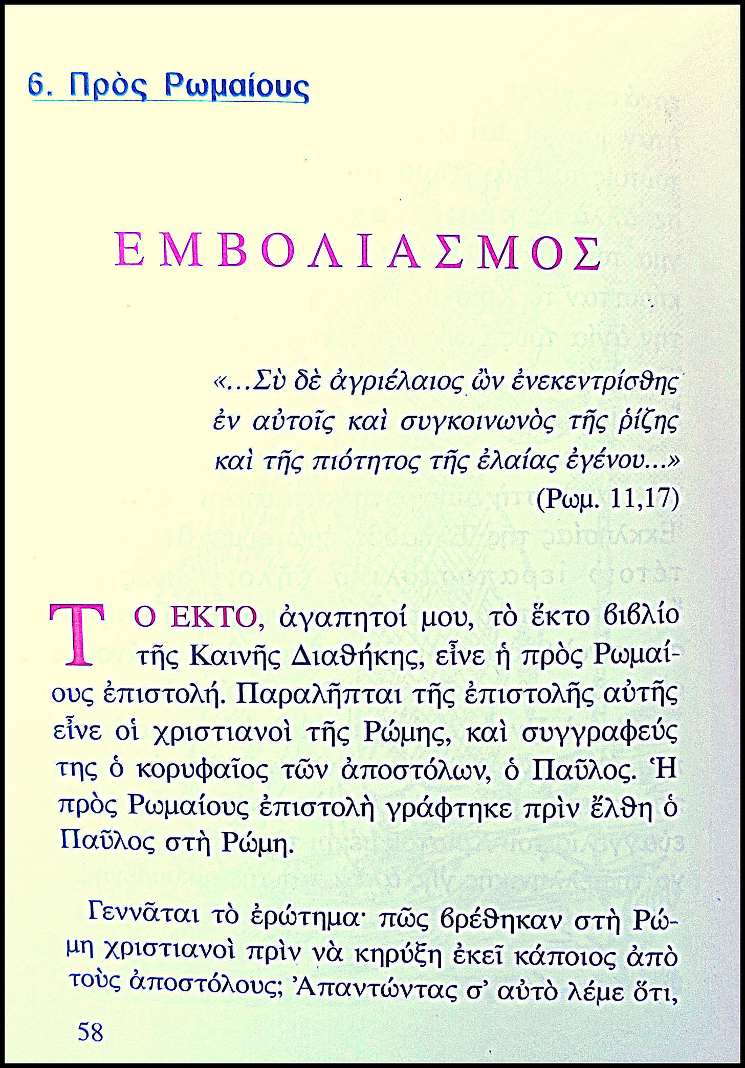 Δυστυχώς αγριελιές έχουν καταντήσει και τα διάφορα πολιτικοοικονομικά συστήματα, με τα οποία κυβερνώνται τα κράτη. Αλλά αγριελιές είνε και τα επί μέρους άτομα. Αγριελιές, άκαρπα δέντρα, είμαστε όλοι. Τι χρειάζεται; Εμβόλιο! Το δε εμβόλιο, ο εγκεντρισμός, είνε ένα και μόνο· ΤΟ ΕΥΑΓΓΕΛΙΟ, η πίστι στις θεμελιώδεις αλήθειες, που κήρυξε ο απόστολος Παύλος και εξακολουθεί να κηρύττη η Εκκλησία μας».