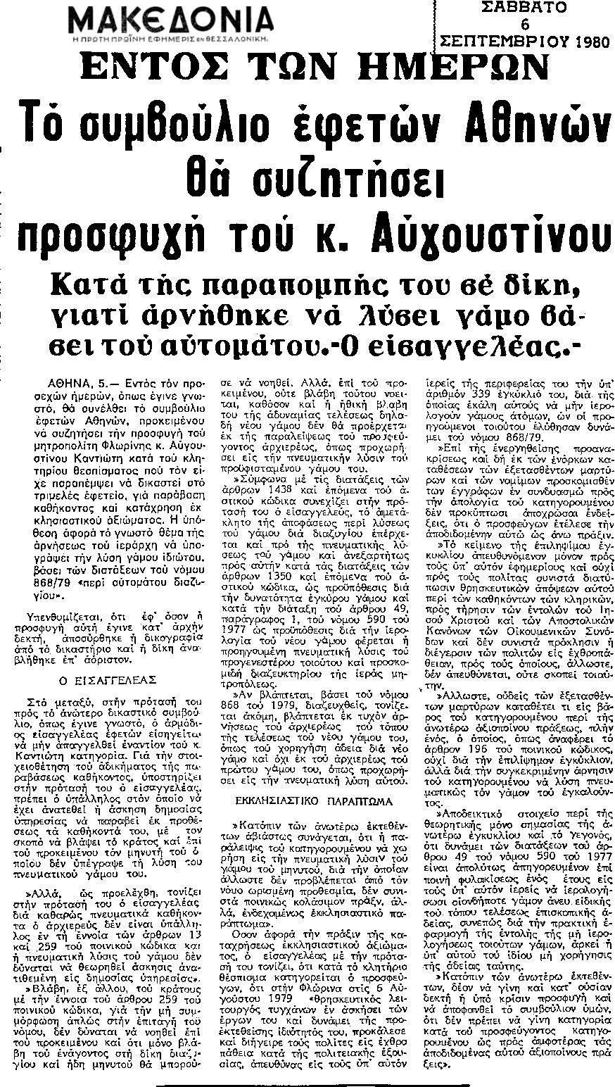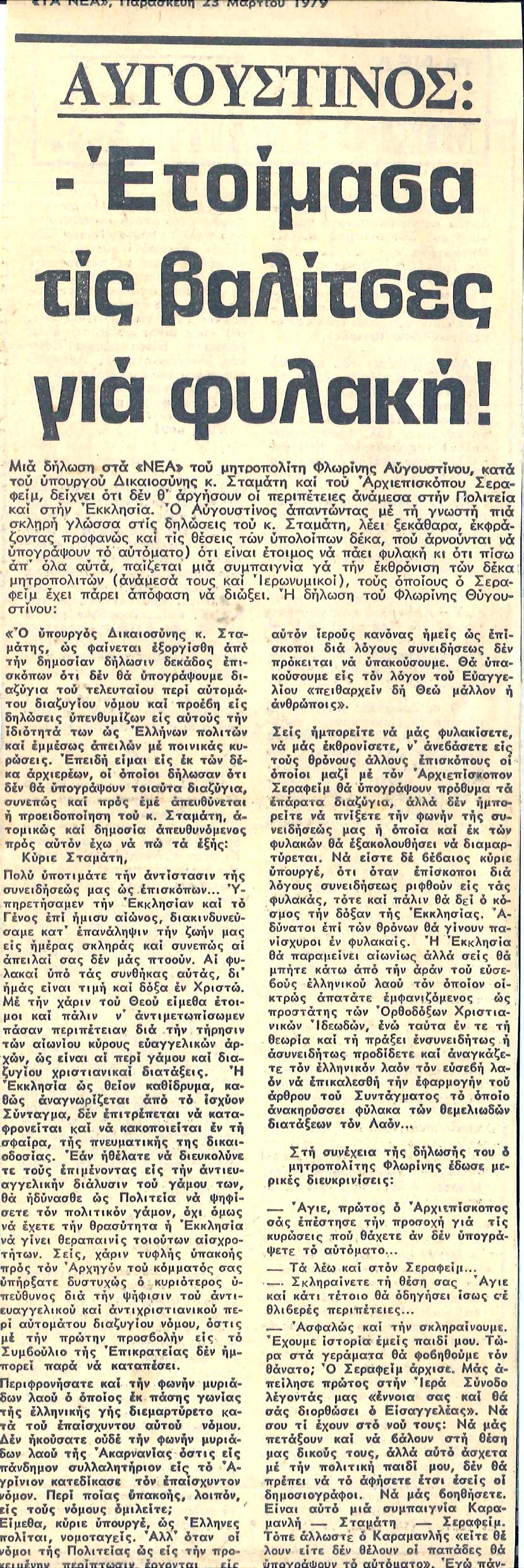 «Ο Χριστόφορος ο Καλύβας, ένας επιστήθιος φίλος μου, σπουδαία φυσιογνωμία, ιστορική φυσιογνωμία, μου έλεγε προ ετών που συζητούσαμε· Ρε Αυγουστίνε, δεν κατάλαβες τι θα γίνη; Ο σατανάς μετεχειρίσθη όλα τα μέσα για να διαλύση την Εκκλησία. Θα μεταχειριστή εις τους έσχατους καιρούς και ένα τελευταίο όπλο. Θα ντύση παπάδες και δεσποτάδες πρόσωπα της εξουσίας του· θα τους φορέση εγκόλπια και θα τους δώση πατερίτσες. Και διά μέσου αυτών των αρχιερέων θα διαλύση την Εκκλησία. Ο σατανάς θα εμφανισθή με ράσα, με άμφια, με πατερίτσες και μπαστούνες!».