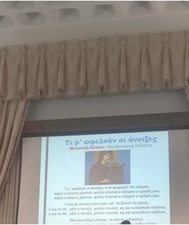 Η εικόνα δε, συνοδεύεται από τους στίχους του τραγουδιού «Τι μ’ οφελούν οι Άνοιξες» του Μάρκου Βαμβακάρη και στο τέλος παρουσιάσθη και βίντεο με την ενορχήστρωση του τραγουδιού. Οι υπεύθυνοι εκπαιδευτικοί έτσι θεώρησαν ότι θα τιμήσουν τους Τρείς Ιεράρχες και τα παιδιά θα διδαχθούν από το παράδειγμά τους…