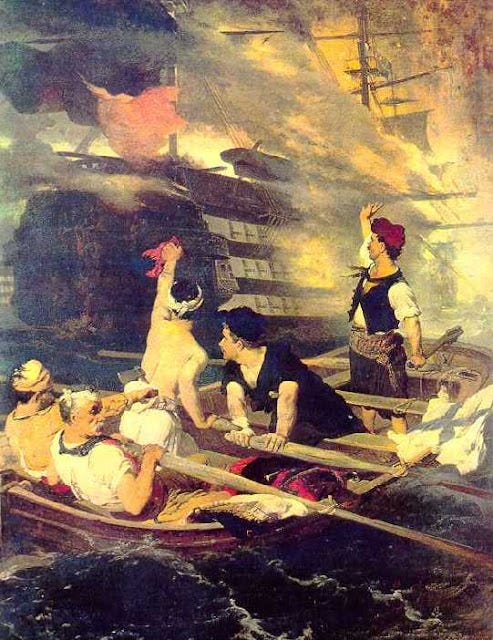 Παραπέρα, βλέπω τὸν Κωνσταντῖνο Κανάρη νὰ πυρπολῇ τὴν ναυαρχίδα τοῦ καπετὰν πασᾶ Καρὰ Ἀλῆ στὴν Χίο καὶ νὰ στέλνῃ στὸν θάνατο 2.000 Ὀθωμανούς, ἀνάμεσά τους καὶ τὸν Καρὰ Ἀλῆ καὶ ἀλλοῦ νὰ ἀνατινάζῃ τουρκικὸ δίκροτο, στὸ στενὸ μεταξὺ Τενέδου καὶ Τρωάδας, τὴν ὑποναυαρχίδα τοῦ νέου ἀρχιναυάρχου Κακλαμάν Μεχμέτ Πασᾶ, ποὺ εἶχε διαδεχθῇ τὸν Καρὰ Ἀλῆ μὲ 800 νεκροὺς Ὀθωμανούς.