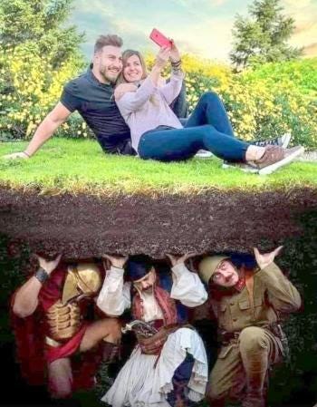 Μέσα ἀπὸ τὰ μνήματα, κάτω ἀπ’ τὴν γῆ ἀκούω ψιθύρους. Ἀκούω τὸν Παῦλο Μελᾶ, τὸν Γερμανὸ Καραβαγγέλη, τὸν μητροπολίτη Δράμας Χρυσόστομο Καλαφάτη, τὸν Ἴωνα Δραγούμη, τὸν στρατηγὸ Δαβάκη καὶ πολλοὺς ἄλλους.