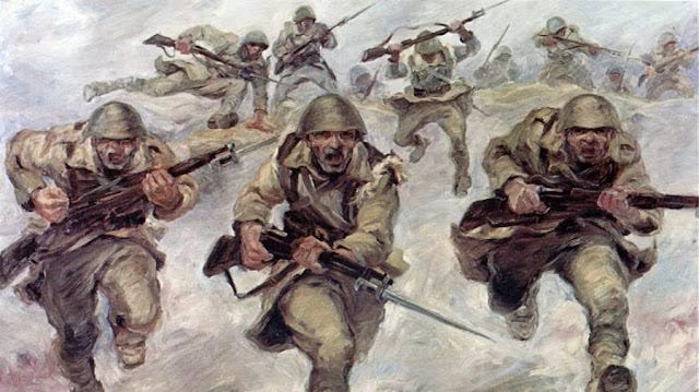 Βλέπω τὸ ὄγδοο μονοπάτι. Κανόνια ἠχοῦν. Μιὰ δυναμικὴ φυσιογνωμία τρέπει τοὺς Ἰταλοὺς σὲ φυγή. Ἀπαντᾷ σὲ ἐντολὲς ἀνωτέρων, ποὺ τὸν προστάζουν γιὰ ὑποχώρησι: «Κρατάω Καλπάκι… Κρατάω Καλπάκι!».