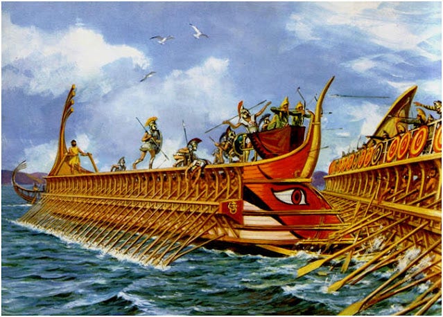 Οἱ ἑλληνικὲς τριήρεις πλαγιοκοποῦν τὸν Περσικὸ στόλο. 4207 πλοῖα καὶ πλοιάρια Περσικά, ἔναντι 366 Ἑλληνικῶν. Στὰ στενὰ τῆς Σαλαμίνας. Στὸν Σαρωνικό κόλπο.
