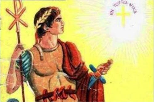 Βλέπω τὸ τέταρτο μονοπάτι. Ψηλὰ στὸν οὐρανὸ φαίνεται ἕνας σταυρός. Καὶ μιὰ φωτεινὴ ἐπιγραφὴ «Ἐν τούτω νίκα». Ἐμψυχωμένος ὁ Φλάβιος Βαλέριος Κωνσταντῖνος ἐκκινεῖ γιὰ τὴν τελικὴ μάχη μὲ τὸν Μαξέντιο.