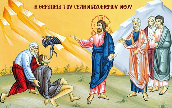 Ἀκόμη ἡ Ἐκκλησία μας προβάλλει καὶ τὴν εὐαγγελικὴ περικοπὴ ποὺ ἀναφέρεται στὴ θεραπεία ἑνὸς δαιμονιζόμενου νέου, ποὺ ἔγινε εὐθὺς μετὰ τὴν κάθοδο τοῦ Κυρίου μας ἀπὸ τὸ ὄρος Θαβώρ, μετὰ τὴ Μεταμόρφωση. Καὶ ἐκεῖνος ὁ ταλαίπωρος πατέρας αὐτοῦ τοῦ δαιμονιζόμενου παιδιοῦ, λέγει στὸν Κύριον: «Διδάσκαλε, ἤνεγκα τὸν υἱόν μου πρὸς σέ(:ἔφερα τὸν υἱόν μου σὲ σένα), ἔχοντα πνεῦμα ἄλαλον. καὶ ὅπου ἂν αὐτὸν καταλάβῃ, ῥήσσει αὐτόν(:τὸν ρίχνει κάτω), καὶ ἀφρίζει καὶ τρίζει τοὺς ὀδόντας αὐτοῦ, καὶ ξηραίνεται(:γίνεται ἀναίσθητος)». Πρόκειται γιὰ μιὰ φρικτὴ περιγραφὴ δαιμονιζόμενου ἀνθρώπου καὶ μάλιστα νέου ἀνθρώπου. Ἀλλὰ ταυτόχρονα προβάλλεται καὶ ἡ ἱστορία ἑνὸς γονιοῦ ποὺ πάσχει ἕνεκα τοῦ δαιμονιζομένου παιδιοῦ του. Τὸ παιδὶ δαιμονισμένο. Ὁ γονιὸς σὲ ἀπόγνωση. Ἀλλὰ ἂς προσεγγίσουμε νὰ δοῦμε αὐτὰ τὰ δύο τραγικὰ πρόσωπα. Τὸ παιδί, ὁ νέος, εἶχε δαιμόνιο· ποὺ ἡ συμπεριφορά του τὸν καθιστοῦσε ἄλαλον καὶ κωφόν. Οὔτε ἄκουγε τὸ παιδί, οὔτε λαλοῦσε. Ὄχι ὅτι δὲν ἄκουγε καὶ δὲν λαλοῦσε ἀλλὰ ὅταν δαιμονίστηκε, οὔτε ἄκουγε οὔτε λαλοῦσε. Εἶχε λοιπὸν πνεῦμα ἄλαλον καὶ κωφόν. Ἐκ τοῦ ἀποτελέσματος κρίνουμε τὸ δαιμόνιον πῶς ἐνεργεῖ. Καὶ τὸ ἀποκαλοῦμε ἔτσι.