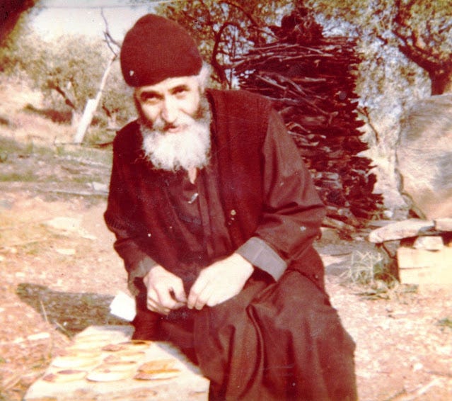 -Σὲ περίμενα! τοῦ εἶπε σὰν τὸν εἶδε, μὲ τὸ ποὺ ἄνοιξε μὲ δυσκολία μιὰ σιδερένια μαγκωμένη ἀπὸ τὸν χρόνο πόρτα! Μὲ ἕνα χιλιομπαλωμένο ράσο, μὲ γένια καὶ μαλλιὰ ἀπεριποίητα καὶ κολλημένα ἀπὸ τὴν ἀλουσία! Μὰ μὲ ἕνα ἀσύλληπτο φῶς νὰ ξεβγαίνει ἀπὸ τὸ μέτωπο καὶ τοὺς κροτάφους... Καὶ εὐωδία! Ἀπερίγραπτη εὐωδία!