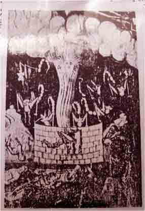 Χρυσῆ φιάλη – ἀτομικὴ βόμβα! Εἰς τὴν ἑρμηνείαν αὐτὴν ἐνισχυόμεθα, ἐὰν ρίψωμεν παρατηρητικὸν βλέμμα καὶ ἴδωμεν πῶς τὸ προφητικὸν βιβλίον τῆς Ἀποκαλύψεως ἔχει εἰκονογραφηθῆ ὑπὸ διασήμων ἁγιογράφων παρελθόντων αἰώνων. Εἰς τὴν ἱερὰν π.χ. Μονὴν τοῦ Ἀγίου Διονυσίου ἐν Ἁγίω Ὄρει μεταξὺ τῶν ἄλλων θαυμασίων εἰκόνων, ποὺ κοσμοῦν τοὺς τοίχους τῆς ἱερᾶς μονῆς, ὑπάρχει καὶ τοιχογραφία εἰς τὴν ὁποίαν εἰκονίζονται σκηναὶ ἐκ τῆς ἱερᾶς Ἀποκαλύψεως. Ὁ παρατηρῶν τὰς εἰκόνας ταύτας, ὅταν τὸ βλέμμα του πέση εἰς μίαν ἐξ αὐτῶν, τὴν εἰκόνα ποὺ δημοσιεύομεν καὶ ἡμεῖς εἰς τὸ παρὸν φύλλον, θʼ ἀναφωνήση κατάπληκτος˙ «Αὐτὴ ἐδῶ ἡ εἰκὼν εἶνε φωτογραφία τῆς ἀτομικῆς βόμβας κατὰ τὴν ὥραν τῆς ἐκρήξεώς της!». Ὁ εὐσεβὴς ζωγράφος, μολονότι ἔζησε 4 καὶ πλέον αἰῶνας πρὸ τῆς διασπάσεως τοῦ ἀτόμου, διὰ τοῦ χρωστῆρός του παρέστησε τʼ ἀποτελέσματα τῆς ἐκ τοῦ ἀέρος ὑπὸ τῶν ἀεροπλάνων ρίψεως φοβερῶν βομβῶν κατὰ τρόπον ποὺ δὲν διαφέρει ἀπὸ τὰ ἀποτελέσματα ποὺ προκαλεῖ πράγματι ἡ ρῖψις ἀτομικῆς βόμβας. Νομίζει τις, ὅτι ὁ ἁγιογράφος ἔζη σήμερον καὶ εἴδε μὲ τοὺς ὀφθαλμούς του μίαν τοιαύτην ἔκρηξιν (Ἰδὲ ἀρχιμ. Γαβριὴλ ἡγουμένου Ἡ ἐν ἁγ. Ὄρει Ἱερὰ Μονὴ τοῦ Ἁγίου Διονυσίου – Ἀθῆναι 1959, σελ. 33-45).