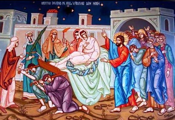 Γι’ αὐτὸ ὁ Χριστὸς συνάντησε τὴν πονεμένη αὐτὴν μάνα, γιὰ νὰ τῆς προσφέρῃ παρηγοριὰ καὶ ἐλπίδα στὴν θλίψη της, ἀνασταίνοντας, μάλιστα, τὸν μονάκριβο υἱό της. Ἐπιλέγει ὁ Κύριος νὰ διασταυρωθῇ ὁ δρόμος Του, ποὺ εἶναι δρόμος ζωῆς, μὲ τὴν πορεία τοῦ ἀνθρώπου πρὸς τὸν θάνατο. Προσφέρεται, ὡς αὐτόκλητος Σωτήρας, νὰ ἀνατρέψῃ τὴν θανατηφόρα αὐτὴν πορεία, νὰ τὴν σταματήσῃ ὁριστικὰ μὲ τὸ ἄγγιγμά Του στὴν σορὸ καὶ τὸν λόγο Του: «Νεανίσκε, σοὶ λέγω, ἐγέρθητι» (Λουκ. ζ’ 14), ποὺ εἶναι προσκλητήριο ζωῆς. Ἐξ ἄλλου, ὁ Ἴδιος ἀποτελεῖ τὴν ὁδό, τὴν ἀνάσταση καὶ τὴν ζωή (Ἰωάν., ιδ’ 6).