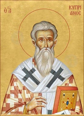 Ἀνάμεσα στοὺς μεγάλους Πατέρες τῆς Ἐκκλησίας μας ξεχωρίζουν κάποιοι, οἱ ὁποῖοι χαρακτηρίζονται ὡς οἰκουμενικοὶ διδάσκαλοι, διότι μὲ τὸ ἔργο τους σφράγισαν τὴν πορεία τῆς Ἐκκλησίας καὶ καθόρισαν τὰ ὅρια τῆς πίστεως σὲ ὁλόκληρη τὴν οἰκουμένη. Ἕνας ἀπὸ αὐτοὺς εἶναι ὁ ἅγιος Κυπριανός, ἐπίσκοπος Καρχηδόνος.