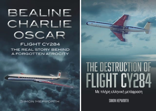 «Bealine Charlie Oscar, Πτήση 284 Η Πραγματική Ιστορία πίσω από μια Ξεχασμένη Θηριωδία» – με την αυτούσια φωτογραφία του αεροπλάνου. Το βιβλίο που χρησιμοποίησε και η Αστυνομική Αναθεώρηση.