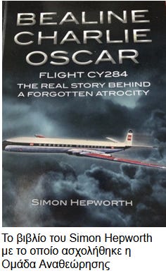 Λίγα χρόνια αργότερα (2017) ο Μιχάλης Θωμαΐδης γνώρισε τον βρετανό συγγραφέα αεροπορικών δυστυχημάτων, πιλότο και πρώην αστυνομικό, Simon Hepworth μέσω της ιστοσελίδας “The Professional Pilots Rumour Network” ο οποίος ενδιαφέρθηκε αμέσως για τη πτήση CY 284. Το ενδιαφέρον του είχε και προσωπικό χαρακτήρα εφόσον τύγχανε να ήταν γείτονες με τον δολοφονηθέντα Καπετάνιο (Captain Gordon Blackwood) του αεροπλάνου. Μας έβαλε σε επαφή ο Μιχάλης και συναντηθήκαμε για πρώτη φορά με τον Simon Hepworth και το γιό του στο Βρετανικό Εθνικό Αρχείο και γνωριστήκαμε. Του εξήγησα το θέμα, του υπέδειξα όλους τους φακέλους συν των δύο κλειστών και συνεργαστήκαμε έκτοτε στην έρευνα όπως εξήγησε και ο ίδιος τόσο στην παρουσίαση του πρώτου του βιβλίου που του κάναμε στην Λεμεσό το 2018 όσο και σε διάφορες συνεντεύξεις του όπως στον Πέτρο Αυξεντίου του Sigmalive το 2022, ως επίσης και στα ίδια τα βιβλία του. Το ίδιο και εγώ στον Πρόλογο μου στα βιβλία του.