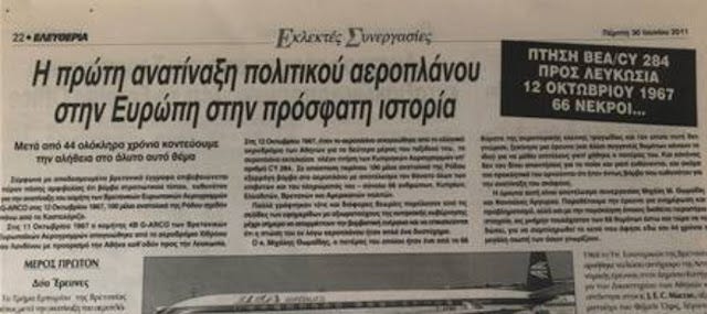 Και έτσι ξεκίνησα και βρήκα όλους τους σχετικούς φακέλους. Του έστειλα αντίγραφα και ξεκινήσαμε να τα μελετούμε. Ετοίμασα ένα κείμενο βάση των εγγράφων στο Αρχείο και άλλες πληροφορίες που πήραμε και δημοσίευσα την έρευνά μας με δύο υπογραφές σε δύο συνέχειες στην ομογενειακή εφημερίδα «ΕΛΕΥΘΕΡΙΑ» στο Λονδίνο. Υπήρχαν όμως και δύο φάκελοι που αφορούσαν την έρευνα της Μητροπολιτικής Αστυνομίας για το έγκλημα της ανατίναξης του αεροπλάνου, γιατί και εφόσον επιβεβαιώθηκε από τις ερευνητικές αρχές ότι ήταν δολιοφθορά, βομβιστική ενέργεια που ανατίναξε το αεροπλάνο, ήταν πλέον έγκλημα, και η έρευνα ανατέθηκε το 1968 (όχι το 1967) στην Μητροπολιτική Αστυνομία. Οι δύο αυτοί φάκελοι παρέμεναν κλειστοί μέχρι το 2040. Κάναμε αιτήσεις για την αποδέσμευσή τους. Και είχα εκτενή αλληλογραφία με τις βρετανικές αρχές για τις αιτιολογίες που πρόβαλαν για την διατήρηση του απορρήτου των φακέλων…