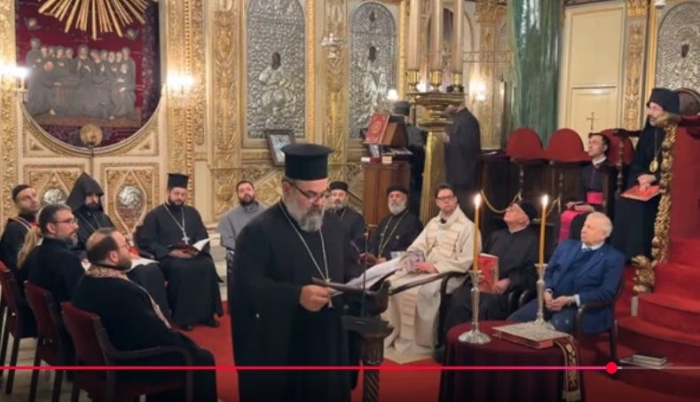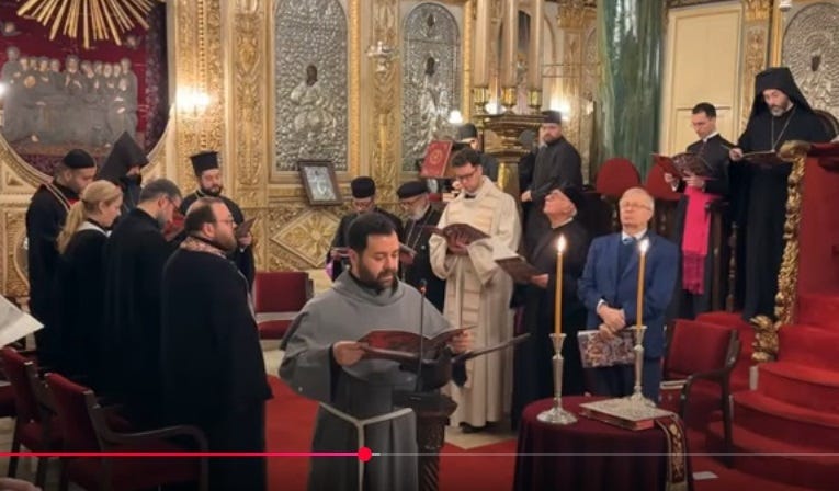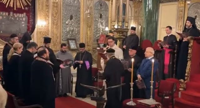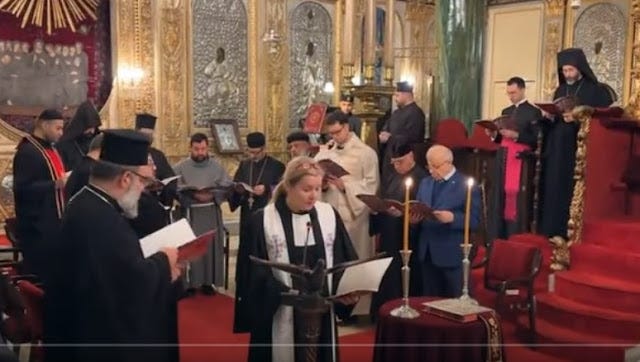 Οἱ φρικώδεις φωτογραφίες εἶναι ἀπό ναό τῆς Κωνσταντινούπολης (Παναγία τοῦ Πέραν), ὅπου στίς 18 Ἰανουαρίου μαζεύτηκαν κάποιοι (κατ’ ὄνομα) Ὀρθόδοξοι, μαζί μέ παπικές κοκκινοσκουφίτσες, προτεστάντικες ἱέρειες καί κάθε λογῆς ἀκόμη αἱρετικά φροῦτα γιά νά «συμπροσευχηθοῦν» (πιό κάτω μπορεῖτε νά δεῖτε καί ὁλόκληρο τό βίντεο), στό πλαίσιο βεβαίως μίας ὁλότελα καινοφανοῦς νεοεποχίτικης ἀκολουθίας. Τά ἴδια ὅμως ἔγιναν καί ἀλλοῦ (π.χ. ἡ συμπροσευχή τήν ἴδια μέρα στόν γνωστό παπικό «ναό» τῆς Θεσσαλονίκης, στήν ὁδό Φράγκων).