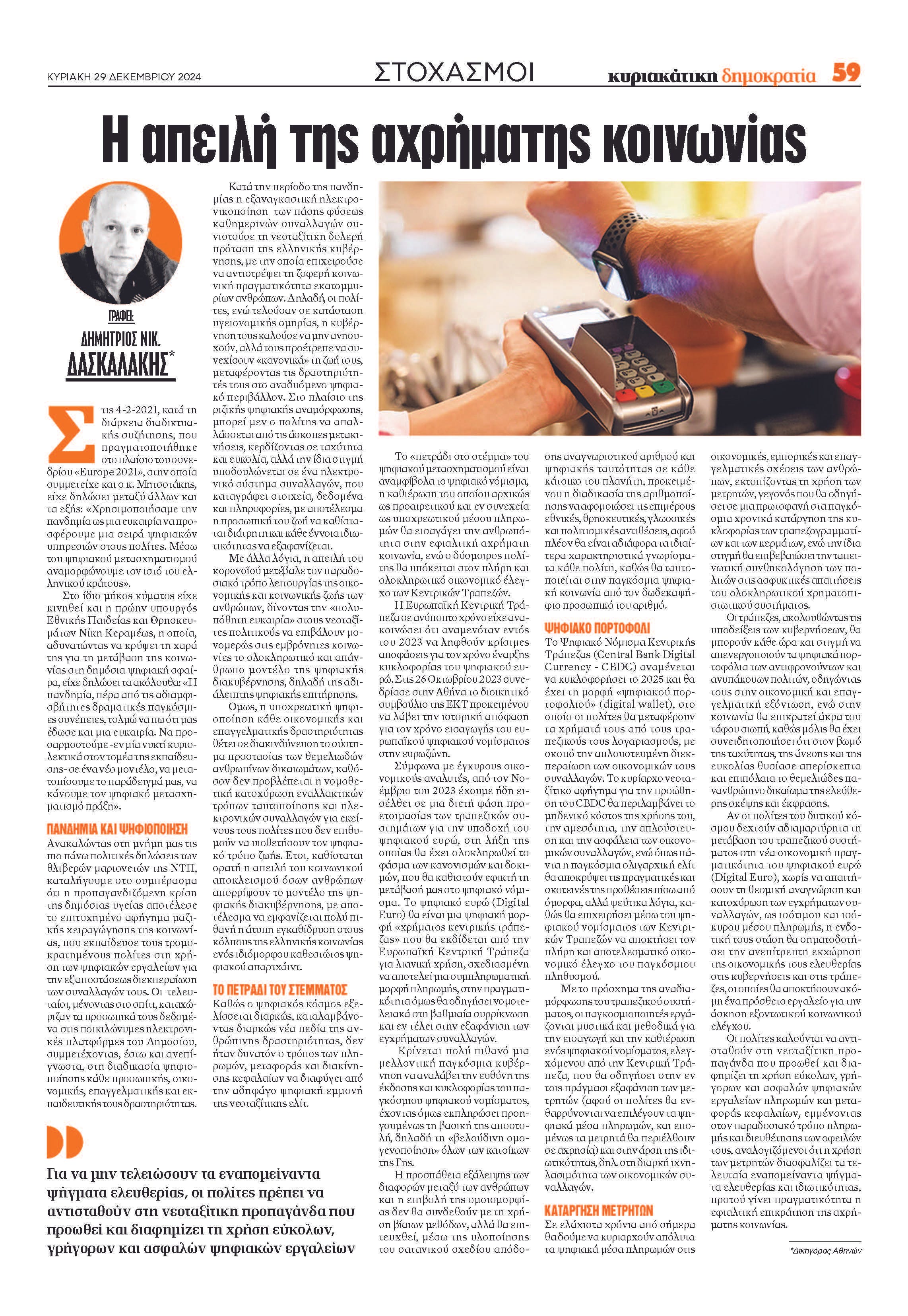 Αν οι πολίτες του δυτικού κόσμου δεχθούν αδιαμαρτύρητα την μετάβαση του τραπεζικού συστήματος στην νέα οικονομική πραγματικότητα του ψηφιακού ευρώ (Digital Euro), χωρίς να απαιτήσουν την θεσμική αναγνώριση και κατοχύρωση των εγχρήματων συναλλαγών ως ισότιμου και ισόκυρου μέσου πληρωμής, η ενδοτική τους στάση θα σηματοδοτήσει την ανεπίτρεπτη εκχώρηση της οικονομικής τους ελευθερίας στις κυβερνήσεις και στις τράπεζες, οι οποίες θα αποκτήσουν ένα ακόμη πρόσθετο εργαλείο για την άσκηση εξοντωτικού κοινωνικού ελέγχου.