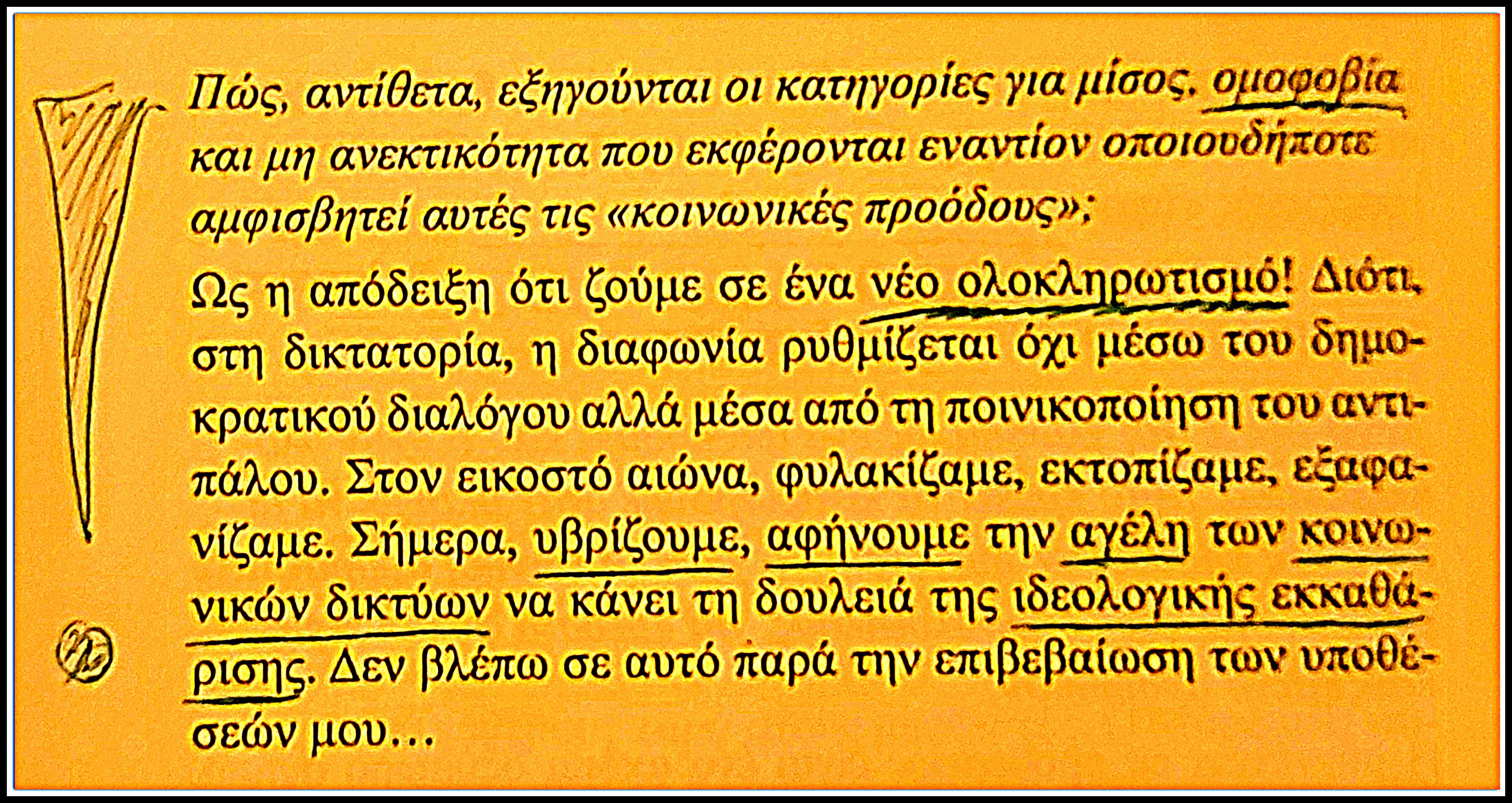 «Πώς εξηγούνται οι κατηγορίες για μίσος, ομοφοβία και μη ανεκτικότητα που εκφέρονται εναντίον οποιουδήποτε αμφισβητεί τις “κοινωνικές προόδους”;»4.