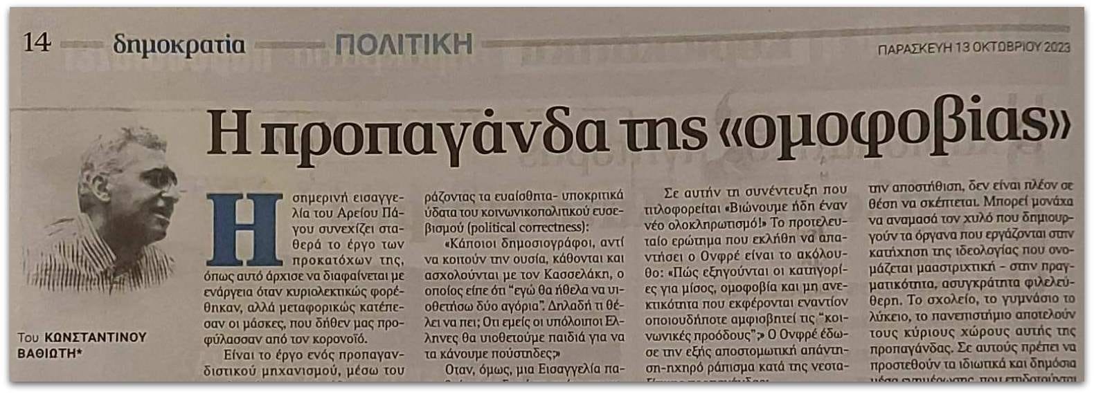 Κωνσταντίνος Βαθιώτης: Η εισαγγελική προπαγάνδα της «ομοφοβίας» και η μομφή του Νέου Ολοκληρωτισμού