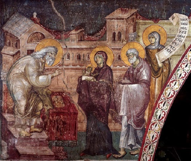 Μεταφέρεται ἔτσι μιὰ κίνηση τοῦ Ἁγίου πρὸς τὸν Κύριο τοῦ Παντός. Τὸν Ἀπερίγραπτον καὶ Δημιουργὸν Θεὸν Λόγον. Τὸν Ἥλιο Τῆς Δικαιοσύνης. Τὸ Δεύτερο πρόσωπο τῆς ἀδιαίρετης Ἁγίας Τριάδας. Σὰν νὰ τρέμῃ ὁ Δίκαιος Πρεσβύτης. Ὄχι μὴν τοῦ πέσει τὸ τεσσαρακονθήμερο βρέφος... Ἀλλὰ γιατί συνειδητοποιεῖ, ὅτι τὸ προρρηθὲν ἐκ τοῦ Προφήτου Ἠσαΐα, αὐτὸ ποὺ κάποτε ὁ ἴδιος ἀκόμα ἀμφισβήτησε ὡς ἄκρο τῶν ὑπερλόγων, ἦρθε ὁ καιρὸς γιὰ νὰ τὸ δῇ καὶ νὰ τὸ ἀγγίξῃ ὁλοζώντανο ἐνώπιόν του. Γιατί γνωρίζει ἀπολύτως πλέον, πὼς τὸ βρέφος τοῦτο, εἶναι ὁ τέλειος Θεὸς καὶ ἄνθρωπος καὶ Ἐκείνη ποὺ τὸν κομίζει ἡ μετὰ τόκον Παρθένος Μητέρα καὶ Βασίλισσα τοῦ κόσμου.