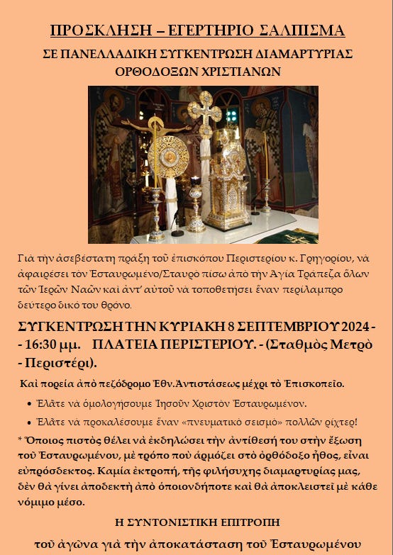 Ἱ.Μ. Περιστερίου, Συγκέντρωση καί Πορεία Ἐνάντια στήν Ἀσεβέστατη Πράξη Ἀπομάκρυνσης τοῦ Ἐσταυρωμένου. (8 Σεπτεμβρίου, 16:30 , Πλατεία Περιστερίου)ΠᾶνοςAug 30, 20241Share«Πᾶνος»Ἐπισκεφθεῖτε καὶ τὸ ἱστολόγιό μας στὸ bloggerhttps://ethnegersis.blogspot.com/Thanks for reading ΕΘΝΕΓΕΡΣΙΣ! Subscribe for free to receive new posts and support my work.SubscribePreviousNext