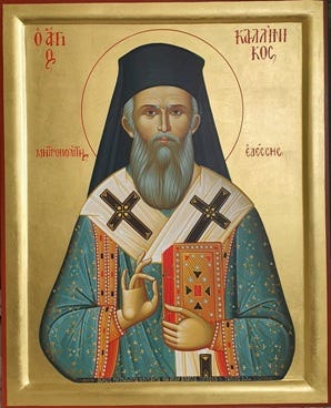 Ἐδέσσης τοῦ Χριστοῦ, Ἱεράρχην τὸν θεῖον, Καλλίνικον πιστοί, ἀνυμνήσωμεν πάντες, ἐσχάτως γὰρ ὡς ἄγγελος, ἐπὶ γῆς οὗτος ἔζησε· κατηχήσας γάρ, τῇ βιοτῇ καὶ τοῖς λόγοις, πάντα ἄνθρωπον, τοῦ Ὀρθοδόξου ποιμνίου, ὡς ἥλιος ἔλαμψε.