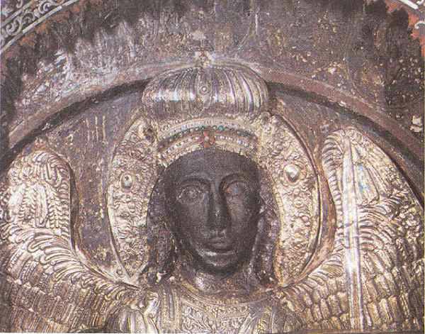 O δόκιμος μοναχός, που από θαύμα σώθηκε μόλις συνήλθε κατηφόρισε μέσα στο Ναό, για να παράσχει τις πρώτες βοήθειες στους συντρόφους του. Εκεί τους βρίσκει όλους σφαγμένους! Τότε του ήλθε μια θεία έμπνευση. Να συγκεντρώσει το αίμα των σφαγμένων μοναχών, να το αναμείξει με χώμα, να φτιάξει πηλό και να ιστορήσει τη μορφή του Αρχαγγέλου Μιχαήλ, όπως την είδε πάνω στη σκεπή, κατά τη θαυμαστή παρουσία Του. Άρχισε να πλάθει την εικόνα του Ταξιάρχη ανάγλυφη, δίνοντας τη μορφή εκείνη που πάνω στη σκεπή ο ίδιος είδε. Ήταν δε τόσο αφοσιωμένος στη προσπάθεια, να δώσει στον πηλό τη μορφή του Αρχαγγέλου ώστε, δεν πρόσεξε ότι ο πηλός τελείωνε! Έτσι τελείωσε το πρόσωπό του και το υπόλοιπο σώμα Του το έφτιαξε αναγκαστικά πολύ μικρό, δυσανάλογο και ασύμμετρο.