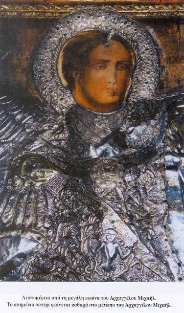 O δόκιμος μοναχός, που από θαύμα σώθηκε μόλις συνήλθε κατηφόρισε μέσα στο Ναό, για να παράσχει τις πρώτες βοήθειες στους συντρόφους του. Εκεί τους βρίσκει όλους σφαγμένους! Τότε του ήλθε μια θεία έμπνευση. Να συγκεντρώσει το αίμα των σφαγμένων μοναχών, να το αναμείξει με χώμα, να φτιάξει πηλό και να ιστορήσει τη μορφή του Αρχαγγέλου Μιχαήλ, όπως την είδε πάνω στη σκεπή, κατά τη θαυμαστή παρουσία Του. Άρχισε να πλάθει την εικόνα του Ταξιάρχη ανάγλυφη, δίνοντας τη μορφή εκείνη που πάνω στη σκεπή ο ίδιος είδε. Ήταν δε τόσο αφοσιωμένος στη προσπάθεια, να δώσει στον πηλό τη μορφή του Αρχαγγέλου ώστε, δεν πρόσεξε ότι ο πηλός τελείωνε! Έτσι τελείωσε το πρόσωπό του και το υπόλοιπο σώμα Του το έφτιαξε αναγκαστικά πολύ μικρό, δυσανάλογο και ασύμμετρο.