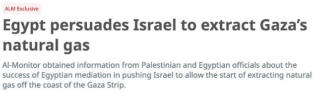 "Η Αίγυπτος κατάφερε να πείσει το Ισραήλ να αρχίσει την εξόρυξη φυσικού αερίου στα ανοικτά των ακτών της Λωρίδας της Γάζας, μετά από αρκετούς μήνες μυστικών διμερών συνομιλιών.