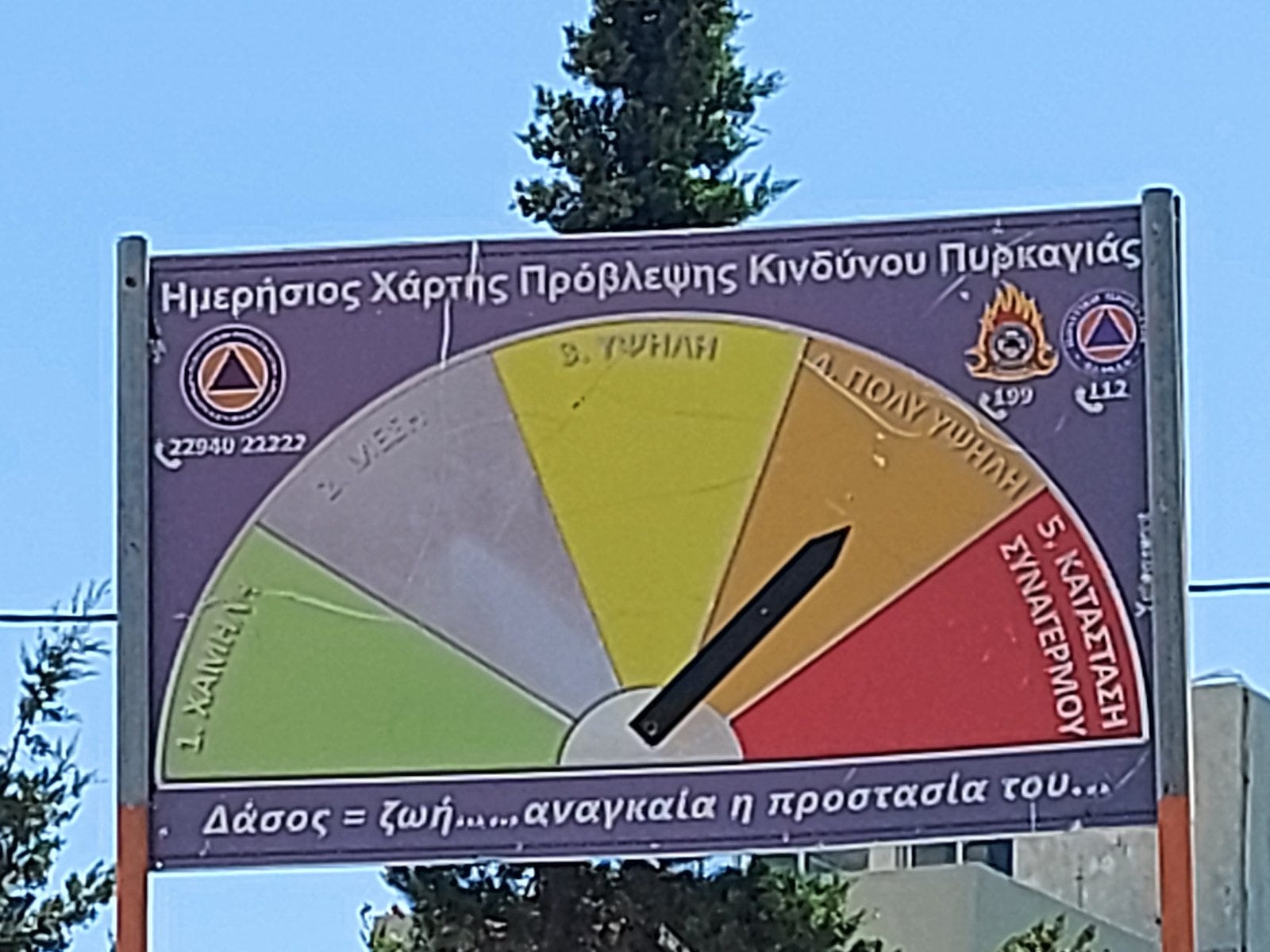 Την ίδια υποκριτική έγνοια για την προστασία του δάσους αντανακλούν οι ημερήσιοι χάρτες πρόβλεψης κινδύνου πυρκαϊάς που, πριν από κάποια χρόνια, εγκατέστησε η Πολιτική Προστασία σε διάφορα σημεία, στους οποίους απεικονίζονται πέντε τρίγωνα διαφορετικού χρώματος ανάλογα με την πιθανότητα να ξεσπάσει πυρκαϊά:
