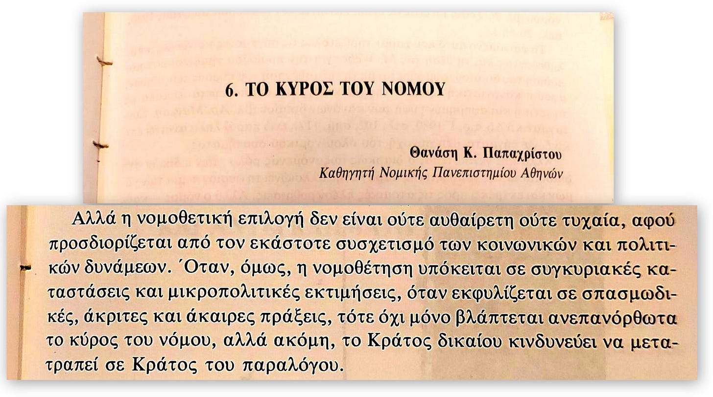 «Όταν […] η νομοθέτηση υπόκειται σε συγκυριακές καταστάσεις και μικροπολιτικές εκτιμήσεις, όταν εκφυλίζεται σε σπασμωδικές, άκριτες και άκαιρες πράξεις, τότε όχι μόνο βλάπτεται ανεπανόρθωτα το κύρος του νόμου, αλλά ακόμη, το Κράτος Δικαίου κινδυνεύει να μετατραπεί σε Κράτος του Παραλόγου».