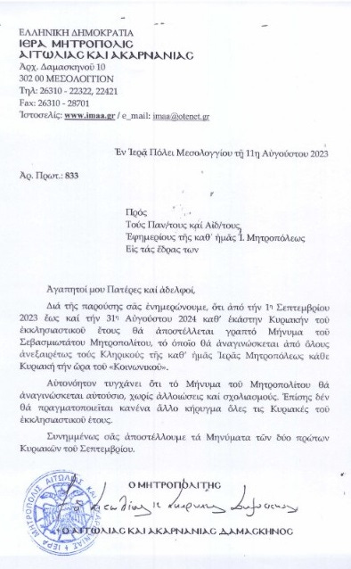 Πραγματικά δέν ἔχουν τελειωμό τά καμώματά τους! Τό τελευταῖο (ἀλλά προφανῶς ὄχι καί στερνό) κροῦσμα εἶναι βεβαίως ὁ εἰκονιζόμενος φετφάς τοῦ μητροπολίτη Αἰτωλοακαρνανίας, διά τοῦ ὁποίου ἀπαγορεύεται σέ ὁποιονδήποτε κληρικό νά κηρύττει τίς Κυριακές μέσα στούς ναούς τῆς ἐν λόγῳ μητρόπολης, ἐπιτρέπεται δέ μόνο ἡ ἐπί λέξει καί ἄνευ ἄλλων σχολίων ἀνάγνωση τῶν κηρυγμάτων πού θά γράφει καί θά τούς ἀποστέλλει ὁ ἴδιος.