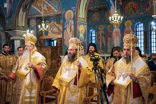 Ὑπενθυμίζω ὅτι πρίν καλά-καλά ἀναλάβει καθήκοντα στή μητρόπολη πού πραγματικά ἐτίμησε μέ τήν πνευματικότατη ποιμαντορία του ὁ μακαριστός μητροπολίτης Κοσμᾶς, ὁ λεγάμενος συλλειτούργησε μέ σχισματικό «ἐπίσκοπο» τῆς Οὐκρανικῆς ψευτοεκκλησίας (πρᾶγμα γιά τό ὁποῖο εἶναι ἤδη ἀπό τότε ἀπό ἱεροκανονικῆς ἄποψης ἄμεσα καθαιρετέος) (2η φωτογραφία), ἐνῶ δέν λέει βεβαίως ὄχι καί γιά ἄλλους νεωτερισμούς (ὅπως π.χ. ἡ θεατρινίστικη «ὑποδειγματική» - Θέ μου ἥμαρτον - Θεία Λειτουργία πρός μαθητές, πού πρό ὀλίγων μηνῶν ἐπετέλεσε ἐκτός τοῦ Ἱεροῦ Βήματος καί κατά πρόσωπον πρός τό ἐκκλησίασμα, κατά τά λατινικά πρότυπα, διακόπτοντας μάλιστα κατά καιρούς τήν ἱερή ἀκολουθία γιά νά ἐξηγεῖ τά δρώμενα, λές καί ἐπρόκειτο περί μαθήματος θρησκευτικῶν) (3η και 4η φωτογραφία).