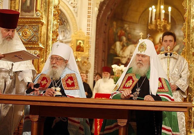 Υπογραφή Συνθήκης Κανονικής Επανένωσης της Ρ.Ο.Ε.ε.Ρ. με τη Ρωσική Ορθόδοξη Εκκλησία Πατριαρχείου Μόσχας, στις17 Μαΐου του 2007. Φωτό: Σ.Βλάσοβ, Β. Χοντακόβ / patriarchia.ru