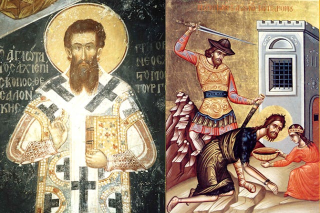 Αλλά και ο βαπτιστής και Πρόδρομος του Κυρίου Ιωάννης εξήλθε από εκείνη την ηρεμία και ερημία; Το έπραξε όμως διότι στάλθηκε από Αυτόν για να δώσει γνώση σωτηρίας στον λαό Του και για να προχωρήσει σε έλεγχο των απειθούντων, εξαιτίας του οποίου ελέγχου έχασε σήμερα και την κεφαλή του από αυτούς. Πραγματικά αυτός δεν έπρεπε να υποστεί φυσικό θάνατο· διότι τέτοιος θάνατος είναι καταδίκη για την παράβαση του Αδάμ, για την οποία δεν είναι οφειλέτης ο υπηρέτης της εντολής, ο υπήκοος στον Θεός από την μητρική γαστέρα ακόμη. Οι άγιοι οφείλουν να δίδουν την ζωή τους για την αρετή και την ευσέβεια κατά την εντολή του Κυρίου· και γι'αυτό κατάλληλος μάλλον σε τούτους είναι ο βίαιος υπέρ του καλού θάνατος· γι'αυτό και ο Κύριος με τέτοιον τρόπο γεύτηκε τον θάνατο. Έπρεπε δε και ο θάνατος του Ιωάννη να είναι πρόδρομος του θανάτου του Χριστού, έτσι ώστε κατά την πατρική προς αυτόν προφητεία να προπορευτεί από τον Κύριο για να δώσει γνώση σωτηρίας και στους ευρισκομένους στο σκότος του Άδη, για να προστρέξουν και εκείνοι και να επιτύχουν την εν Χριστώ μακαρία και αθάνατη ζωή.