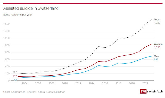 Τον τελευταίο καιρό, πάνω από 1.700 Ελβετοί κάτοικοι έχουν διαπράξει υποβοηθούμενη αυτοκτονία μέσα σε ένα χρόνο. Επιπλέον, πάνω από 500 άτομα από το εξωτερικό ταξιδεύουν στην Ελβετία με αυτό το σκοπό κάθε χρόνο. Και η ζήτηση αυξάνεται: οι παρατηρητές αναμένουν ότι ο αριθμός των υποβοηθούμενων αυτοκτονιών στην Ελβετία θα διπλασιαστεί έως το 2035.