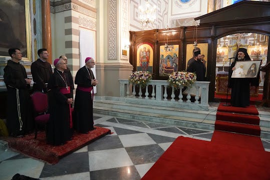 «Καὶ νῦν, Παναγιώτατε Δέσποτα, δεχθῆτε, παρακαλῶ, ἀνιστορηθέντα ζωγραφικὸν πίνακα, ἀπεικονίζοντα τὴν Α. Ἁγιότητα, τὸν Πάπαν Ρώμης παραδιδoῦσαν τὴν χρῆσιν τοῦ Ἱεροῦ τούτου Ναοῦ εἰς τὴν Ὑμετέραν Παναγιότητα, καὶ παρακαλῶ ὅπως ἕτερον ἴδιον, ἐπιδώσητε καὶ εἰς τὴν παρισταμένην Ἀντιπροσωπείαν τῶν Φραγκισκανῶν Ἀδελφῶν, εἰς ἀνάμνησιν τῆς σημερινῆς ἱστορικῆς ἡμέρας».