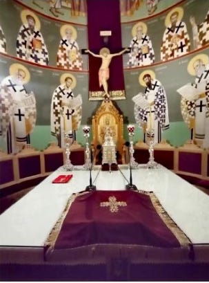 Αποσβολωμένοι οι ορθόδοξοι πιστοί παρακολουθούμε το παγκόσμιο φαινόμενο της αντικαταστάσεως του Εσταυρωμένου μέσα στο ιερό των εκκλησιών από μια…¨πολυθρόνα¨!!! Εξοβελίζεται ο Εσταυρωμένος από την Αγία τράπεζα, το ιερό θυσιαστήριο, «διότι επ’ αυτής τελείται η θυσία του Αμνού του Θεού υπέρ πάντων των πιστών, ζώντων και τεθνεώτων» την κατά φύσιν θέση του δηλαδή, και είτε τυλίγεται σε ένα σεντόνι και τοποθετείται σε κάποια αποθήκη του ναού, ή για να σωθούν τα προσχήματα τοποθετείται όπισθεν της κεντρικής πολυθρόνας του συνθρόνου… ποιος;;; ο Κύριος και Θεός Σωτήρ Ημών Ιησούς Χρίστος ….στην πλάτη του εκάστοτε Επισκόπου!!!
