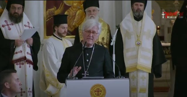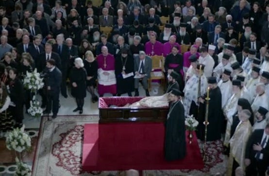 Καί οὐδείς ἀκόμη ἔχει τό δικαίωμα νά παραβλέπει καί τήν τελευταία, ὁλότελα τραγική εἰκόνα: το πολύχρωμο δηλαδή αἱρετικό τσίρκο μέ τούς παπικούς καρδινάλιους, τούς λουθηρανούς «ἐπισκόπους» καί τά λοιπά ἐξωτικά φροῦτα, πού παρέλασαν στήν κηδεία του, φυσικά καί πάλι μέ ἐγκώμια καί ὑμνολογίες. Ἔχει κάποιος ἄραγε τήν ψευδαίσθηση ὅτι θά μποροῦσε ποτέ ὁποιοσδήποτε ἀπό αὐτούς νά συμπεριφερθεῖ ἀνάλογα γιά τήν ἐξόδιο ἀκολουθία ἑνός πραγματικοῦ προμάχου τῆς Ὀρθοδοξίας; Δέν ἦταν ἀπολύτως πασιφανές ὅτι ὅλοι αὐτοί ἔνιωθαν τήν ὥρα ἐκείνη ὅτι τιμοῦσαν καί ἀποχαιρετοῦσαν ἕναν «δικό» τους ἄνθρωπο; Καί στά ἐρωτήματα αὐτά εἶναι ἐπίσης πρόδηλες οἱ ἀπαντήσεις.
