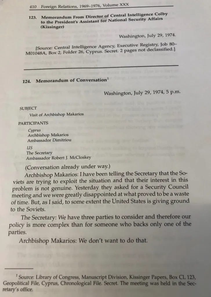 Ο Μακάριος ξεκίνησε λέγοντας του Κίσινγκερ ότι οι Σοβιετικοί προσπαθούσαν να εκμεταλλευθούν την κατάσταση, το ενδιαφέρον τους δεν ήταν γνήσιο… Μόνο οι ΗΠΑ μπορούσαν να επηρεάσουν Τουρκία και Ελλάδα αμφότερες μέλη του ΝΑΤΟ και που έπαιρναν στρατιωτική βοήθεια από τις ΗΠΑ. Το Κυπριακό πρόβλημα ήταν πολύ μικρό για τις ΗΠΑ και δεν ήταν σωστό να έλεγαν στις ΗΠΑ να κάνει αυτό ή το άλλο για πιέσεις.