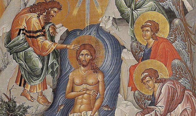 Άλλ' ήρθε ή ώρα να εμφανιστεί. Και τότε παρουσιάστηκε ό Ιωάννης ό Πρόδρομος. Κήρυττε μετάνοια και είλκυε κόσμο πολύ. Όλοι έσπευδαν στα ρείθρα του Ιορδανού, μετανοούσαν και έβαπτίζοντο. Μέσα στο πλήθος ήρθε και ό Χριστός. Ήταν απέριττος, χωρίς κάποιο εξωτερικό διακριτικό• δέ φορούσε διάδημα. Ό Ιωάννης όμως διέκρινε, ότι κάτω από το φτωχικό του παρουσιαστικό υπήρχε ή Θεότης. Τον αντελήφθη, γι' αυτό ακριβώς ήταν εκεί. Ό Χριστός του λέει• —Βάπτισε με. Ό Ιωάννης• —Δεν είμαι άξιος• εγώ έχω ανάγκη να βαπτισθώ από σένα. Ό Χριστός επιμένει καΐ στο τέλος ό Ιωάννης πειθαρχεί. Κι όταν τον βάπτισε, τότε άνοιξαν οι ουρανοί, είδε το Πνεύμα το άγιο σαν περιστερά λευκή να κατεβαίνει επάνω στην κεφαλή του Χριστού μας, και ακούστηκε ή φωνή του ουρανίου Πατρός να μαρτυρεί γι' αυτόν. Έτσι απεκαλύφθη το μέγα μυστήριο.
