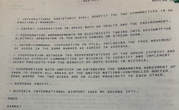 25 Μαΐου 1993 - Ο Σερ Ντέιβιντ Χάνεϊ αρίθμησε τα 12 ΜΟΕ που συμφώνησαν οι δύο ηγέτες, Κληρίδης/Ντενκτάς, συν του Αεροδρομίου και Βαρωσίων και έγραψε: