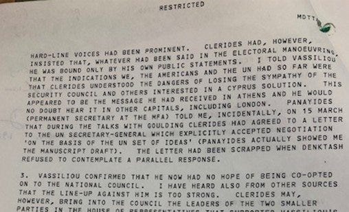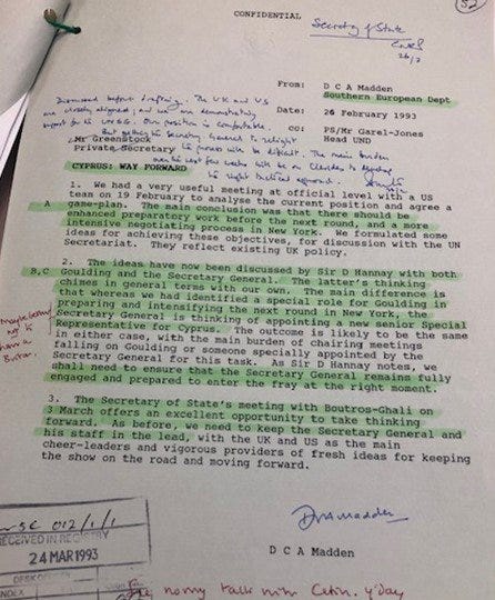 Τα νέα έγγραφα του Φόρεϊν Όφις για το 1993 μάς αποκαλύπτουν και πάλι τον πρωταγωνιστικό ρόλο των Βρετανών, τις διάφορες υποχωρήσεις/παραχωρήσεις του Προέδρου Γλ. Κληρίδη, με τα Μέτρα Οικοδόμησης Εμπιστοσύνης, «Ιδέες Γκάλι», αποδοχή συνομοσπονδίας, τι έλεγαν για τους εποίκους, πιέσεις Μητσοτάκη στον Κληρίδη, θέμα Βαρωσιού, απόφαση να μην αποδεσμευθούν φάκελοι για πληροφοριοδότες και άλλα.