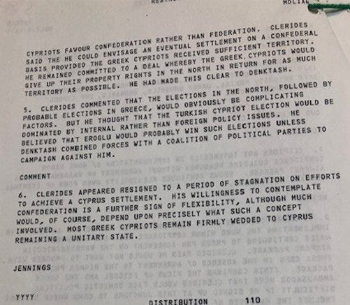 «Η αποφασιστικότητά του να σκέφτεται συνομοσπονδία είναι ακόμα μια ένδειξη της ελαστικότητάς του, αν και αυτό βέβαια εξαρτάται από το τι ακριβώς θα συνεπάγεται. Οι περισσότεροι Ελληνοκύπριοι επιμένουν έντονα για ένα ενιαίο κράτος» ολοκλήρωσε ο αξιωματούχος Jennings.