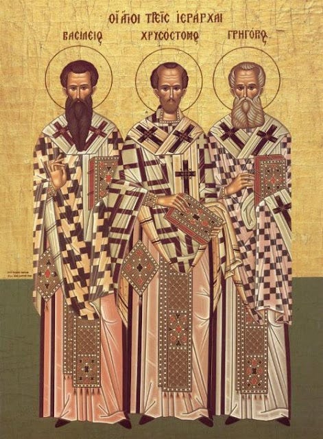 Στὶς 30 Ἰανουαρίου ἡ Ἐκκλησία μας ἔχει ὁρίσει νὰ ἑορτάζεται ἀπὸ κοινοῦ ἡ μνήμη τῶν Ἁγίων Τριῶν Ἱεραρχῶν, τῶν Μ. Βασιλείου, Γρηγορίου τοῦ Θεολόγου καὶ Ἰωάννου Χρυσοστόμου καὶ ἡ Πολιτεία νὰ τοὺς τιμᾶ ὡς προστάτες τῆς παιδείας, τῆς ἐπιστήμης καὶ τοῦ πολιτισμοῦ, διότι οἱ ἴδιοι ἐνσάρκωσαν αὐτὰ τὰ ἀγαθὰ καὶ ἔγιναν φορεῖς μιᾶς πρωτόγνωρης πνευματικότητας, ξέχωρη ἀπὸ αὐτὴ ποὺ γνώριζε καὶ βίωνε ὁ προχριστιανικὸς κόσμος, καρπὸς τῆς ἐπενέργειας τοῦ Ἁγίου Πνεύματος, ἡ ὁποία μεταποιεῖ καὶ μεταμορφώνει τὸν κόσμο, φορεῖς ἑνὸς νέου πολιτισμικοῦ ἰδεώδους, τοῦ ἑλληνοχριστιανικοῦ.