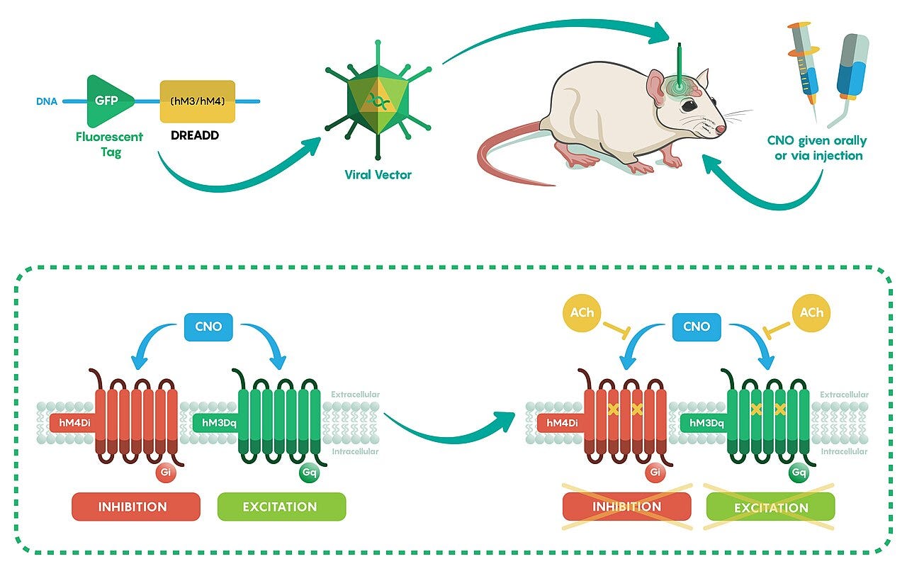 Οι DREADD είναι τεχνητοί υποδοχείς που μπορούν να τοποθετηθούν σε νευρώνες μέσω γενετικής τροποποίησης σε πειραματόζωα, όπως ποντίκια. Αυτοί οι τεχνητοί υποδοχείς επιτρέπουν στους ερευνητές να ελέγχουν τη νευρική δραστηριότητα σε συγκεκριμένες ομάδες νευρώνων, χρησιμοποιώντας ειδικά σχεδιασμένα φάρμακα που επιδρούν μόνο σε αυτούς του τεχνητούς υποδοχείς.