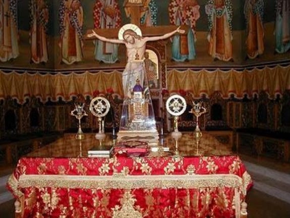 Πολὺ θόρυβος γίνεται μὲ τὸν ἀξιολύπητον ἐπίσκοπον Περιστερίου Γρηγόριο, ποὺ ἔβγαλε τὸν Ἐσταυρωμένο ἀπὸ τὴν ἀνατολικὴν πλευρὰν τῆς Ἁγίας Τραπέζης, μᾶλλον γιὰ νὰ φαίνονται τὰ πρόσωπα τῶν ἐπισκόπων, ὅταν κάθονται εἰς τὸ Σύνθρονον. Ἐγὼ μπῆκα στὰ ἐνενῆντα καὶ ἐνθυμοῦμαι ὅτι στὴν ἐκκλησία τοῦ χωριοῦ μου πάντα ὑπῆρχε ὁ Ἐσταυρωμένος πίσω ἀπὸ τὴν Ἁγία Τράπεζα. Καὶ εἰς τὸ μέσον του Συνθρόνου, λίγο κάτω ἀπὸ τὸ παράθυρο τοῦ ἱεροῦ, εὑρίσκετο ἡ εἰκόνα τῆς ἁγίας Τριάδος· ὄχι τῆς παπικῆς, ἀλλὰ τῆς Ὀρθόδοξης μὲ τὴν φιλοξενία τοῦ Ἀβραάμ.