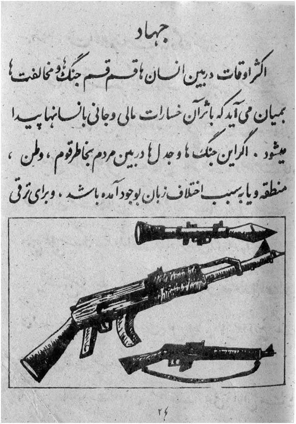 Τα εγχειρίδια, τα οποία ήταν γεμάτα με λόγια για τζιχάντ και παρουσίαζαν σχέδια με όπλα, σφαίρες, στρατιώτες και νάρκες, χρησίμευσαν έκτοτε ως το βασικό πρόγραμμα σπουδών του αφγανικού σχολικού συστήματος. Ακόμη και οι Ταλιμπάν χρησιμοποιούσαν τα αμερικανικής παραγωγής βιβλία ....
