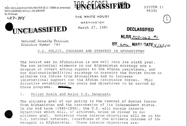 Ο πρόεδρος Ρόναλντ Ρέιγκαν εξέδωσε (και υπέγραψε) την Οδηγία 166 για την Απόφαση Εθνικής Ασφάλειας (NSDD 166), η οποία εκ των πραγμάτων ενέκρινε την «ενισχυμένη μυστική στρατιωτική βοήθεια προς τους Μουτζαχεντίν», καθώς και την υποστήριξη της CIA στη θρησκευτική κατήχηση.