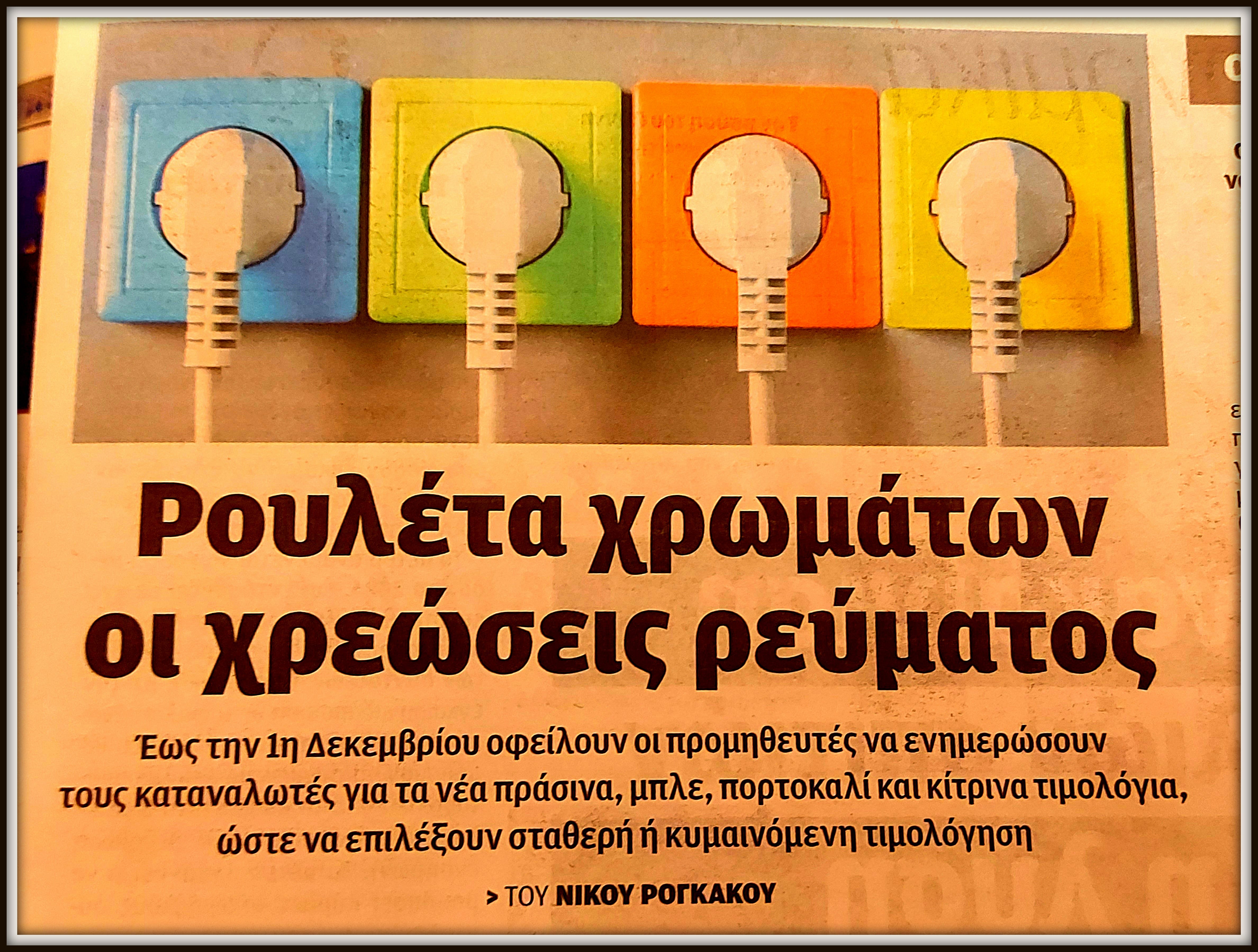 Μάλιστα, υπήρξαν ακόμη και φιλοκυβερνητικές-νεοταξίτικες φυλλάδες που δεν αισχύνθηκαν να παρομοιάσουν την επιλογή χρώματος για το τιμολόγιο της ΔΕΗ με το θανατηφόρο παιχνίδι της ρώσικης ρουλέτας. Χαρακτηριστικό παράδειγμα το πρωτοσέλιδο της εφημερίδας «Η Βραδυνή της Κυριακής» (φύλλο της 18-19 Νοεμβρίου 2023), η οποία, όπως οι περισσότερες εφημερίδες της ψευτοδημοκρατικής Ελλάδας, λιβανίζει νυχθημερόν το καθεστώς Μητσοτάκη.