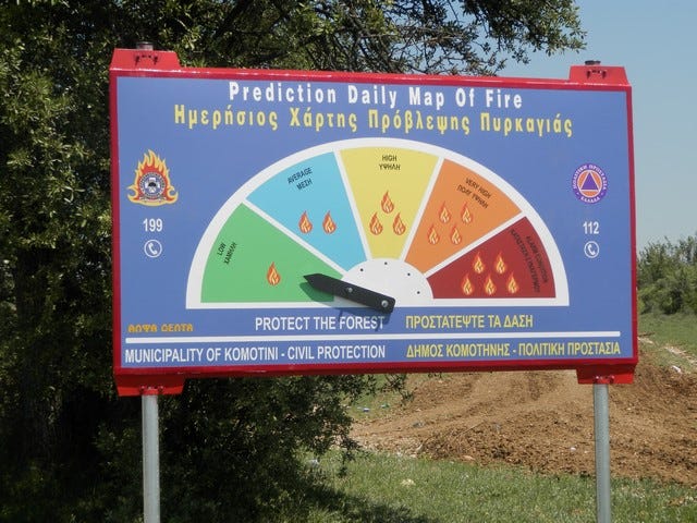 Τον ημερήσιο χάρτη πρόβλεψης κινδύνου πυρκαϊάς, στον οποίο απεικονίζονται πέντε τρίγωνα διαφορετικού χρώματος ανάλογα με την πιθανότητα να ξεσπάσει πυρκαϊά;