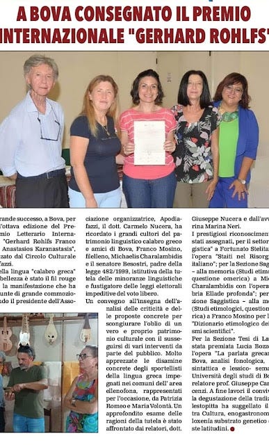 Ειδικότερα, τα βραβεία απονεμήθηκαν, στον Fortunato Stelitano για το έργο του «Staiti nel Risorgimento italiano», στον Franco Mosino για το έργο του «Ετυμολογικό λεξικό των επιστημονικών ελληνικών όρων», στη Lucia Bozzoli για το έργο της «η ελληνική γλώσσα της Μπόβα, φωνολογική, μορφοσυντακτική και λεξικο-σημασιολογική ανάλυση» και στον Μιχάλη Χαραλαμπίδη για το έργο του «Καλαβρία, η βαθιά Ελλάδα».